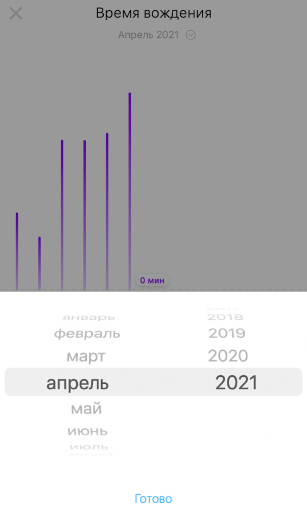 При детальном просмотре в приложении вы можете выбрать месяц, для которого необходимо отобразить статистику. Для этого нажмите на название указанного месяца и в приложении отобразится список месяцев, для которого можно просмотреть статистику по времени вождения.